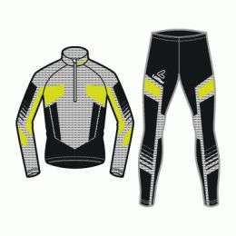 Hochelastisch, schnell trocknend, atmungsaktiv, Allover-Druck, Mesheinsätze unter dem Arm, Stehkragen, extralanger Frontzip, langarm, offener Arm- und Bundabschluss, lange Hose mit Bundweitenregulierung.