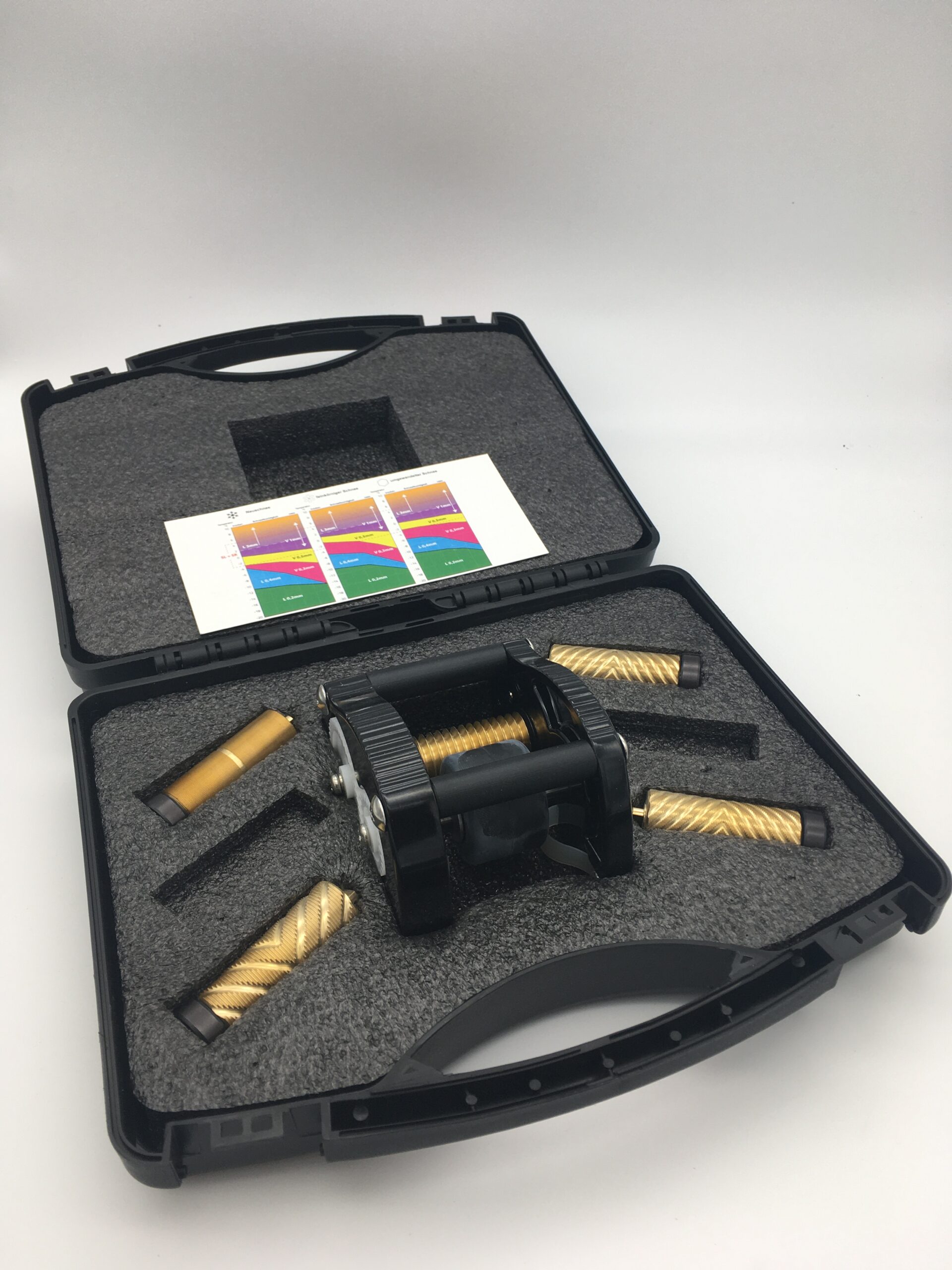 inklusive 5 Strukturrollen aus Messing- Linear: mit 0,4mm und 3mm- V-Form: mit 0,3, 0,5 und 1mm inkl. Aufbewahrungsbox