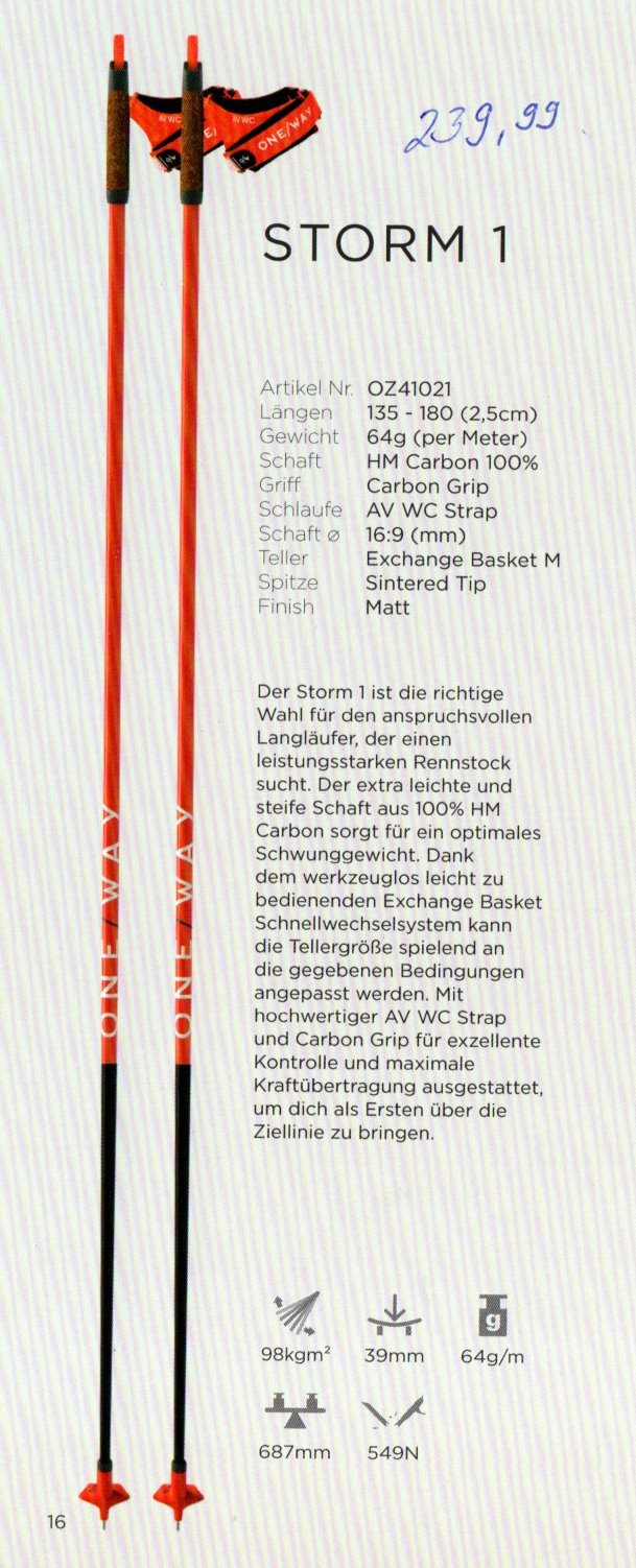 Der Storm 1 ist die richtige Wahl für den anspruchsvollen Langläufer, der einen leistungsstarken Stock sucht. Der extra leichte und steife Schaft aus 100 % HM Carbon sorgt für ein optimales Schwunggewicht. Dank dem werkzeuglos leicht zu bedienenden Exchange Basket Schnellwechselsystem kann die Tellergröße spielend an die gegebenen Bedingungen angepasst werden. Mit hochwertiger AV WC Strap und Carbon Grip für exzellente Kontrolle und maximale Kraftübertragung ausgestattet, um dich als Ersten über die Ziellinie zu bringen.